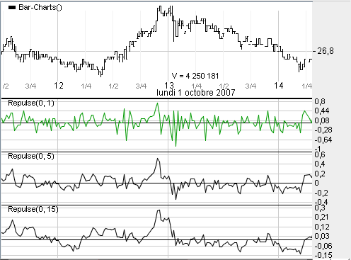C'est un indicateur complémentaire qui doit être comparé à l'évolution des cours. Son principal intérêt est de ne pas être lié à l'évolution des cours comme un RSI, un MACD ou un Stochastic. Il apporte des informations supplémentaires utiles sur la confiance des traders dans l'évolution des cours.Pour le trading des futures, une bonne méthode consiste à afficher sur le même graphe le Repulse(P1) pour l'examen de la tendance à très court terme, le Repulse(5*P1) pour le court terme et le Repulse(15*P1) pour le moyen terme.