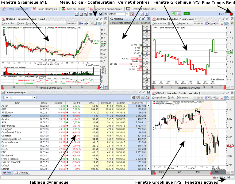 Il n'y a pas de limitation du nombre de fenêtres graphiques, carnets d'ordres et listes de transactions pouvant être ouverts simultanément.