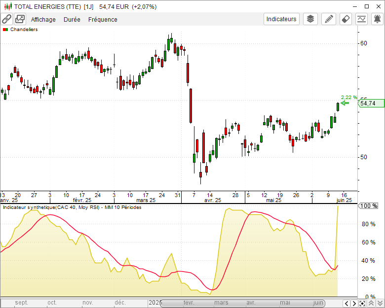 Le graphique de l'indicateur synthétique présenté en histogramme donne à chaque période le pourcentage des valeurs du CAC 40 pour lesquelles le signal précédent est vrai.